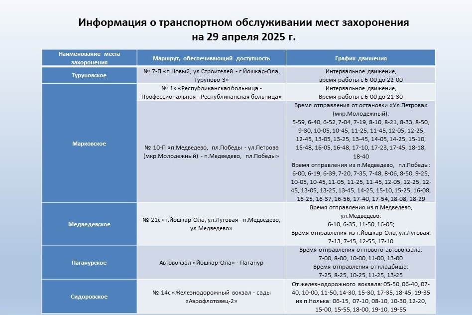 В Йошкар-Оле и пригороде до кладбищ запустят дополнительные рейсы автобусов. Расписание движения транспорта сообщили в Минтрансе Марий Эл.