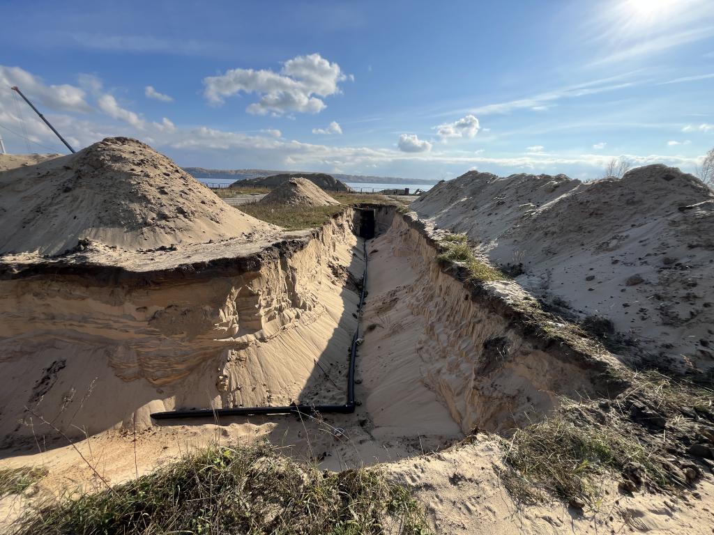 Сейчас на месте стройки готовят основание будущего причала. На данный момент уже завершены работы по прокладке наружного водопровода, устанавливается шпунтовое ограждение.