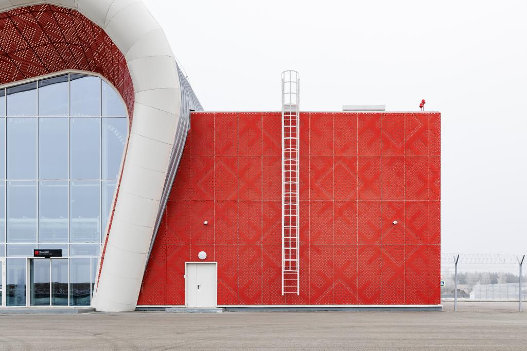 В облицовке терминала применены перфорированные навесные элементы в национальной стилистике и использован фирменный красный оттенок, который стал ярким акцентом всей концепции.