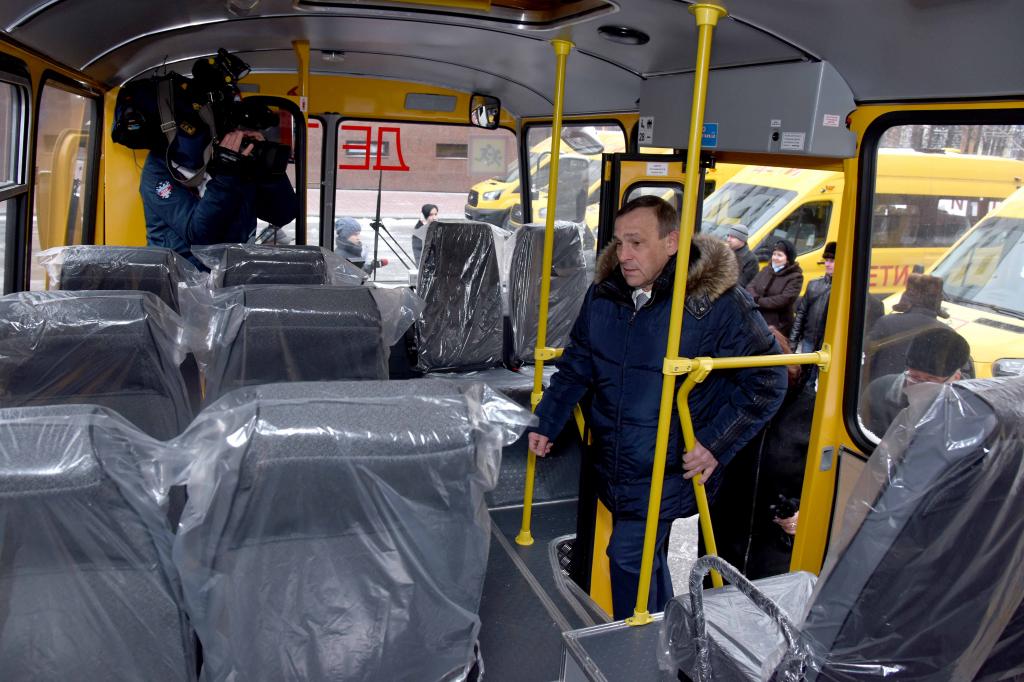 Александр Евстифеев осмотрел один из школьных автобусов, подчеркнув при этом, что все транспортные средства соответствуют техническим требованиям, необходимым для перевозки детей.
