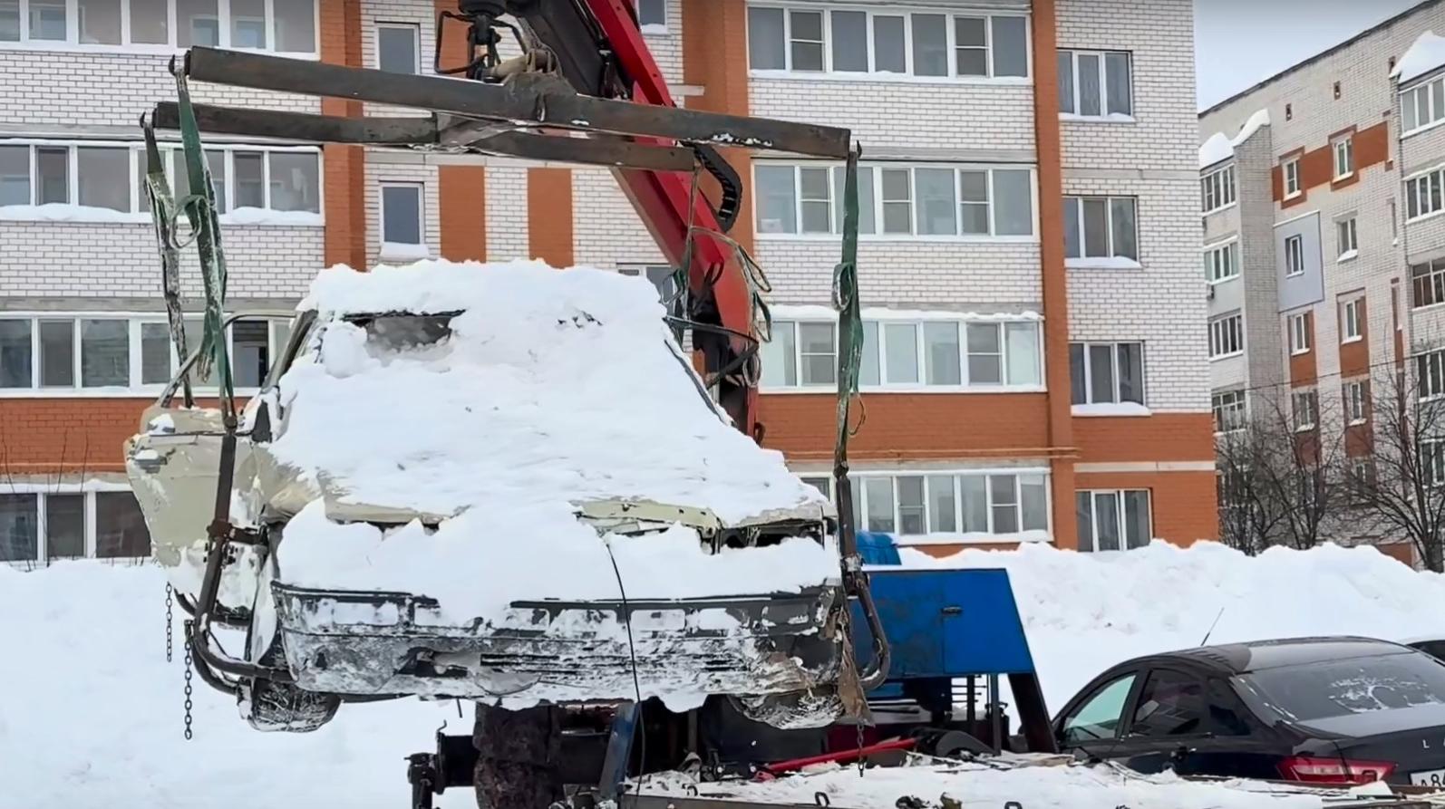 Со двора на ул. Яна Крастыня, д. 6 эвакуировали брошенный и разукомплектованный автомобиль.