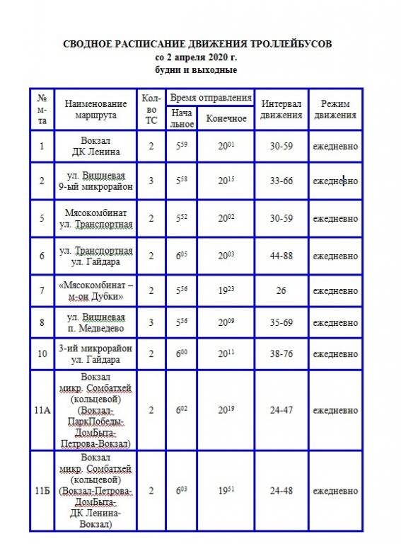 Кроме того, сокращено количество троллейбусов на линиях и подкорректирован график их работы на остальных направлениях. Интервал движения — от 24 до 59 минут.