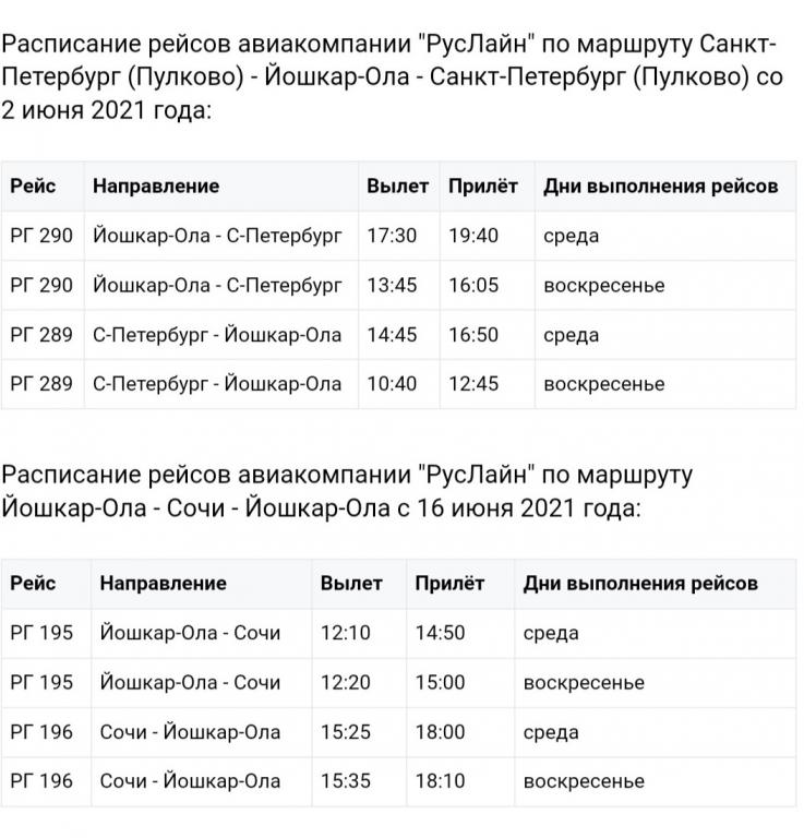 Со среды, 16 июня, меняется расписание рейсов авиакомпании «РусЛайн» по маршруту Москва (Внуково) — Йошкар-Ола — Москва (Внуково), сообщает портал в ВКонтакте «Авиация в Марий Эл».
