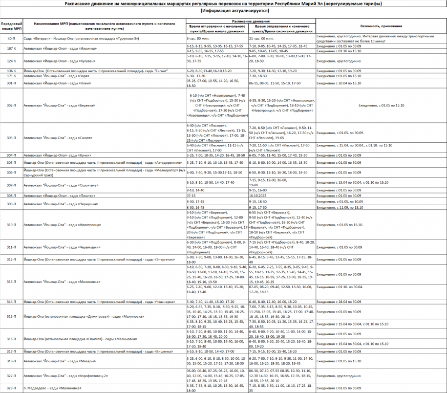 | 308-П | Автовокзал «Йошкар-Ола» — сады «Пиштер» | 07-15 | 16.10.2022 | Ежедневно с 01.05 по 30.09 |