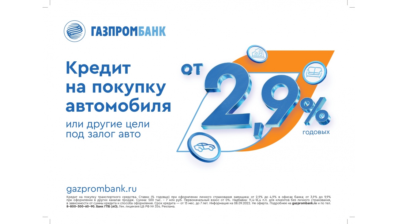 Газпромбанк снизил ставки по кредитам на покупку автомобиля и на любые цели под залог авто. Теперь ставка в офисах Газпромбанка составляет: 2,9% годовых – при оформлении личного страхования заемщика и автомобиля в залог, 4,9% годовых – без залога. Если кредит оформляется в мобильном приложении (12+) или на сайте Газпромбанка, ставка составит от 3,9% до 9,9% годовых при наличии личного страхования заемщика.