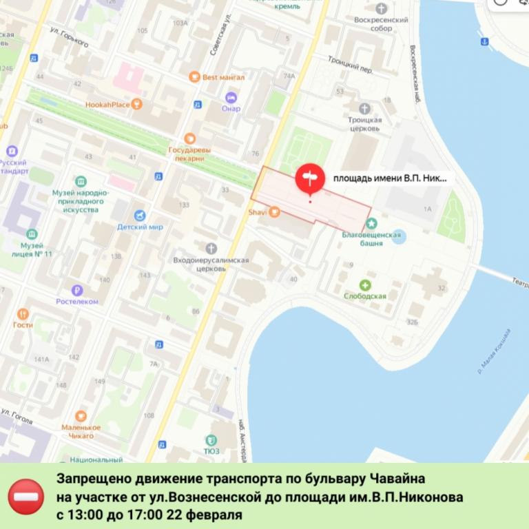 С 13:00 до 17:00 будет закрыт участок от ул. Вознесенской до площади им. Никонова и на парковке бульвара у дома № 31 (корпус 1). Кроме того, возле этого же дома с утра до 17:00 запрещена остановка и стоянка.