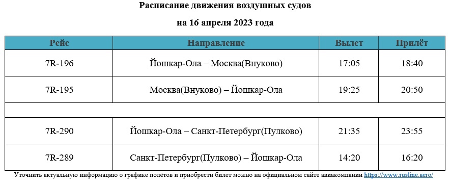 По информации портала «Аэропорт «Йошкар-Ола», в воскресенье, 16 апреля 2023 года, изменится расписание движения воздушных судов из столицы Марий Эл в Москву, Санкт-Петербург и обратно.