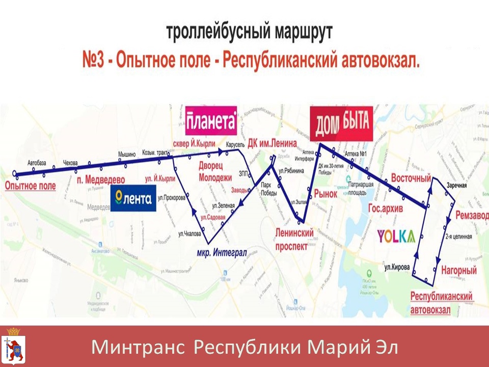 В Минтрансе Марий Эл напоминают йошкаролинцам о работе нового троллейбусного маршрута № 3 «Опытное поле — Республиканский автовокзал». Он был запущен в этом году с 30 апреля.