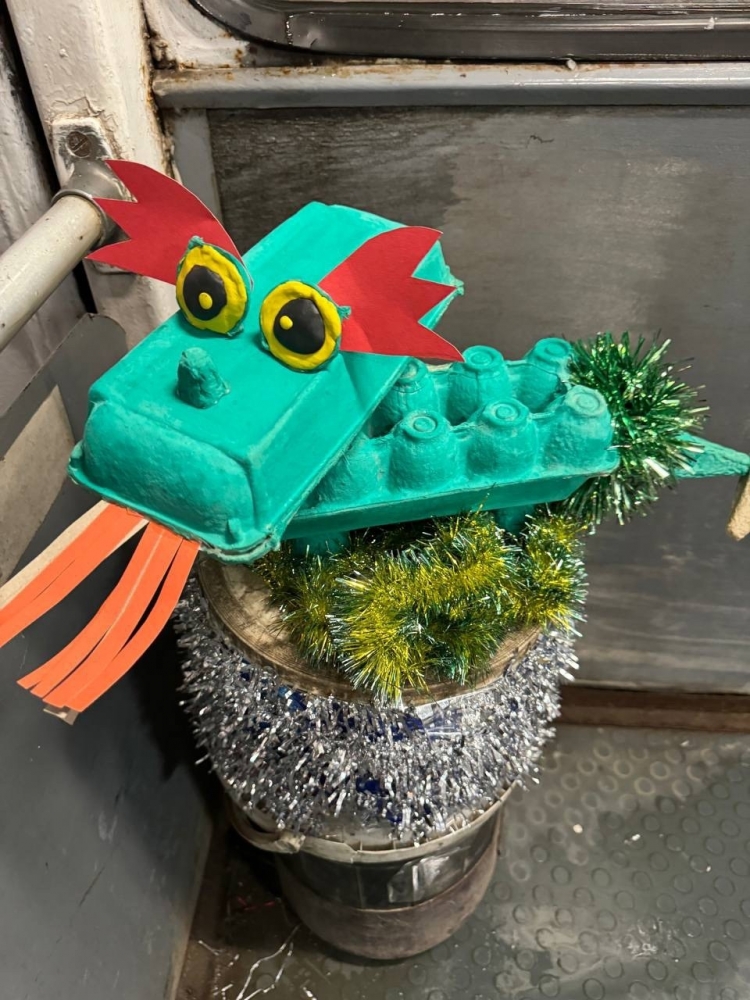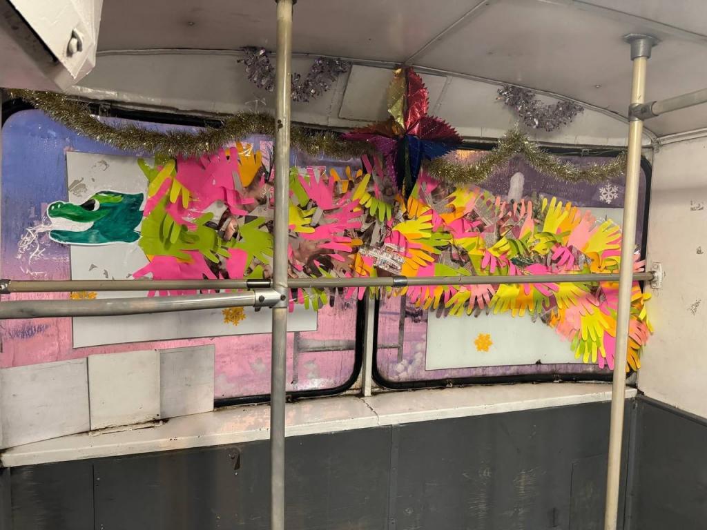 Салоны троллейбусов украсили мишурой, снежинками, ёлочками, гирляндами, поздравительными плакатами. В троллейбусах поселились снеговики и символ Нового года — драконы.