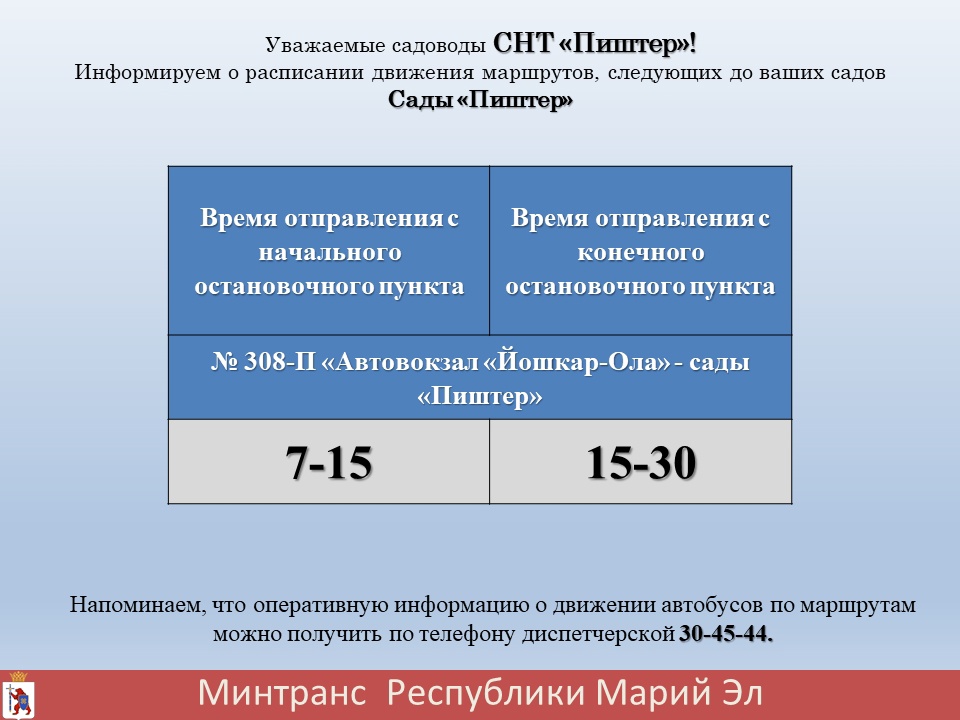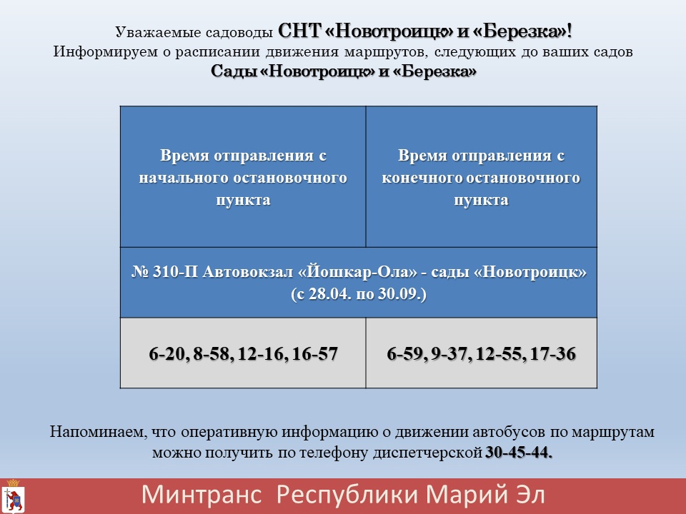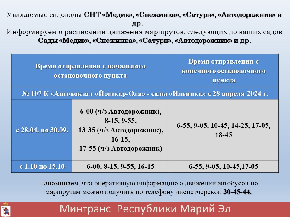 В Министерстве транспорта и дорожного хозяйства Республики Марий Эл утвердили расписание движения автобусов на летне-осенний период в СНТ.