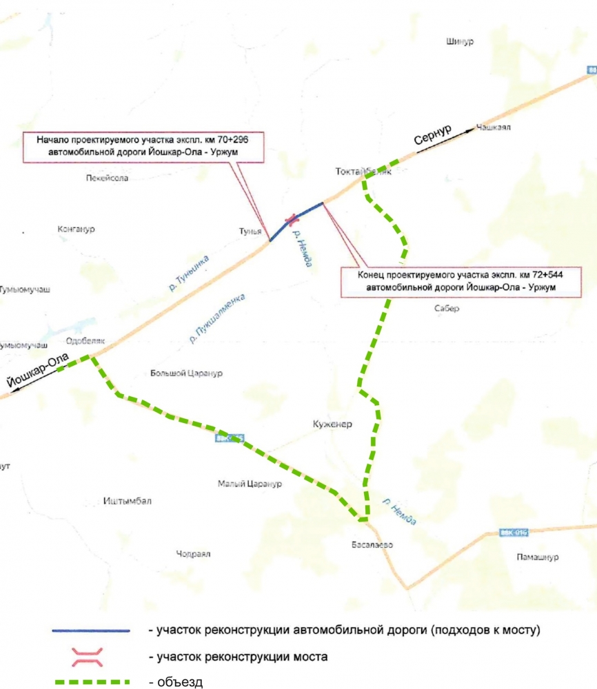 С 26 сентября планируется перекрытие дороги «Йошкар-Ола — Уржум» на участке реконструкции моста через реку Немда на 71 км перед селом Токтайбеляк.