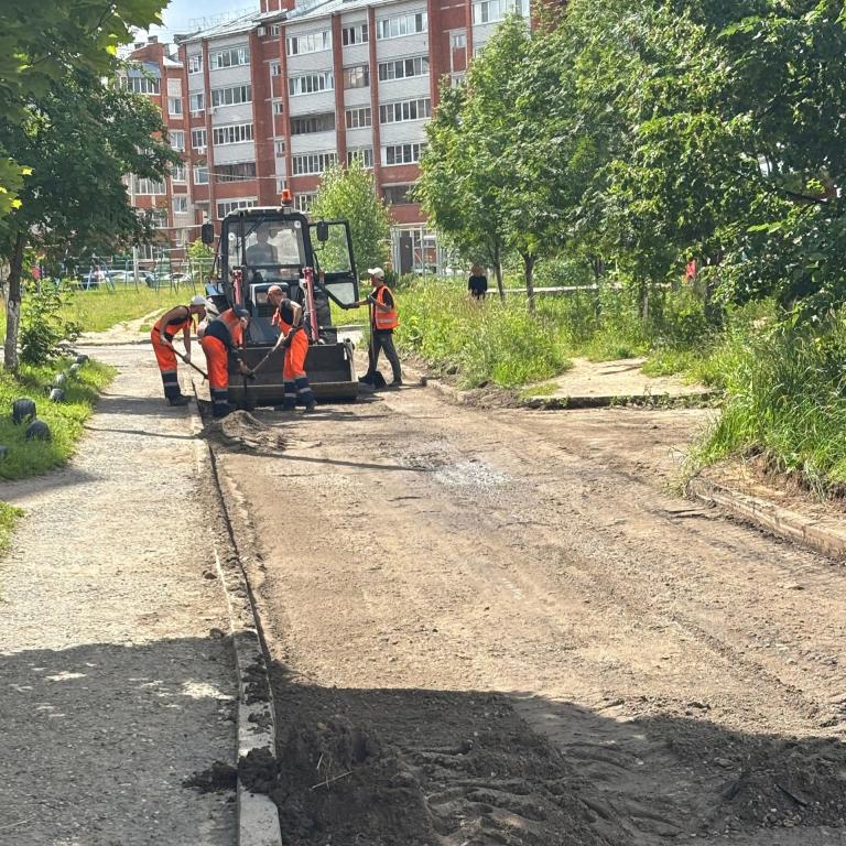 В это время дорожники были заняты на ремонте межквартального проезда на ул. Строителей, возле домов 32а и 34б. Дорога ведет к социально значимому учреждению — детскому саду «Пчёлка», а также к батутному центру «Арена».