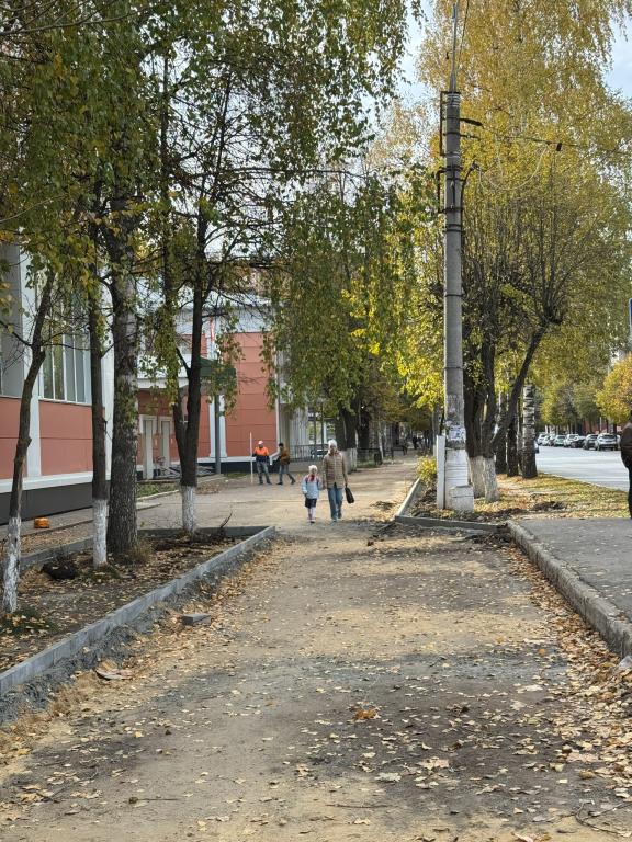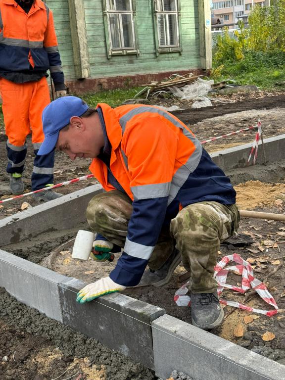 В юбилейный год возле учреждения ремонтируют тротуар. Дорожники уже начали устанавливать бортовой камень и формировать водоотводные уклоны. Эти меры позволят решить основную проблему участка — скопление дождевой воды.