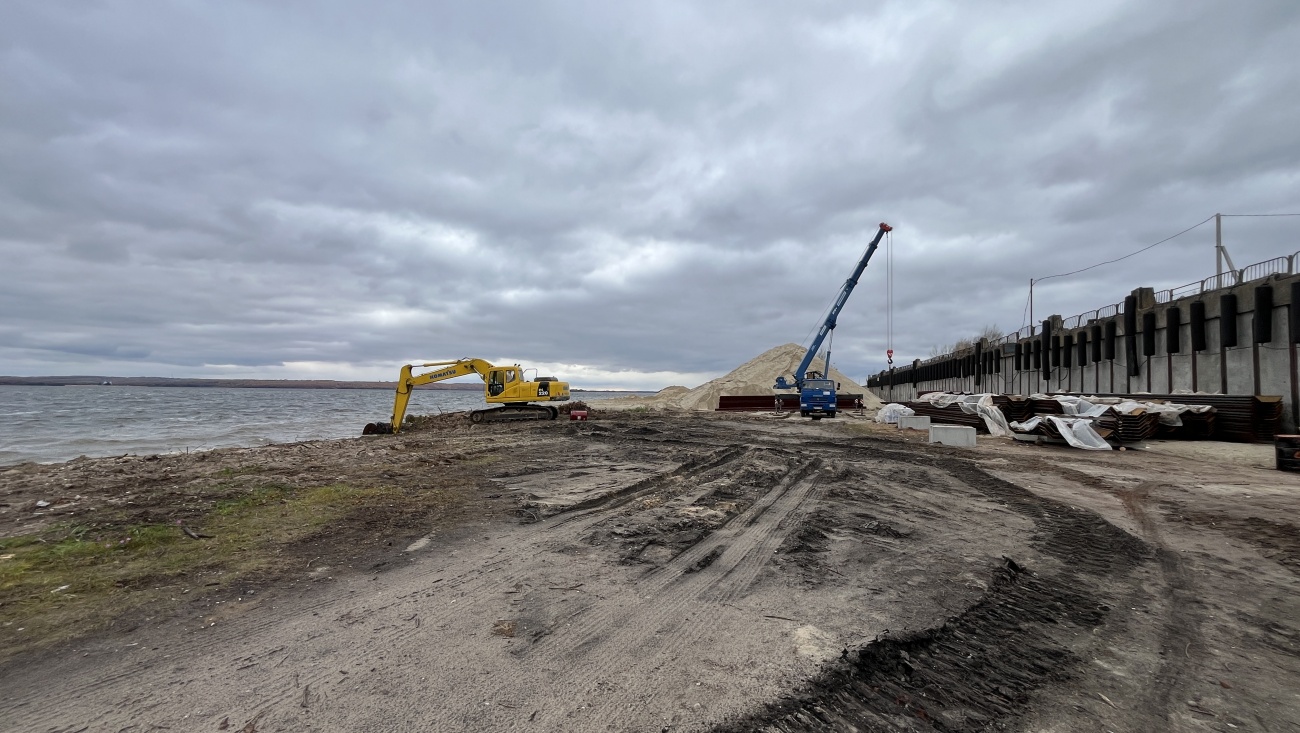 Сейчас на месте стройки готовят основание будущего причала. На данный момент уже завершены работы по прокладке наружного водопровода, устанавливается шпунтовое ограждение.
