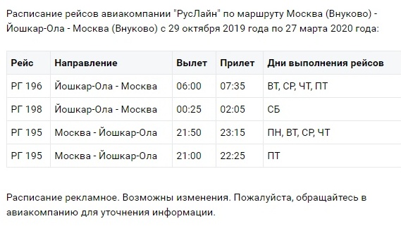 Теперь утренний рейс из Йошкар-Олы отправляется в 6 часов утра с прилетом в аэропорт Внуково в 7:35. По субботам вылететь из Йошкар-Олы можно в 00:25 с прибытием в Москву в 2:05.