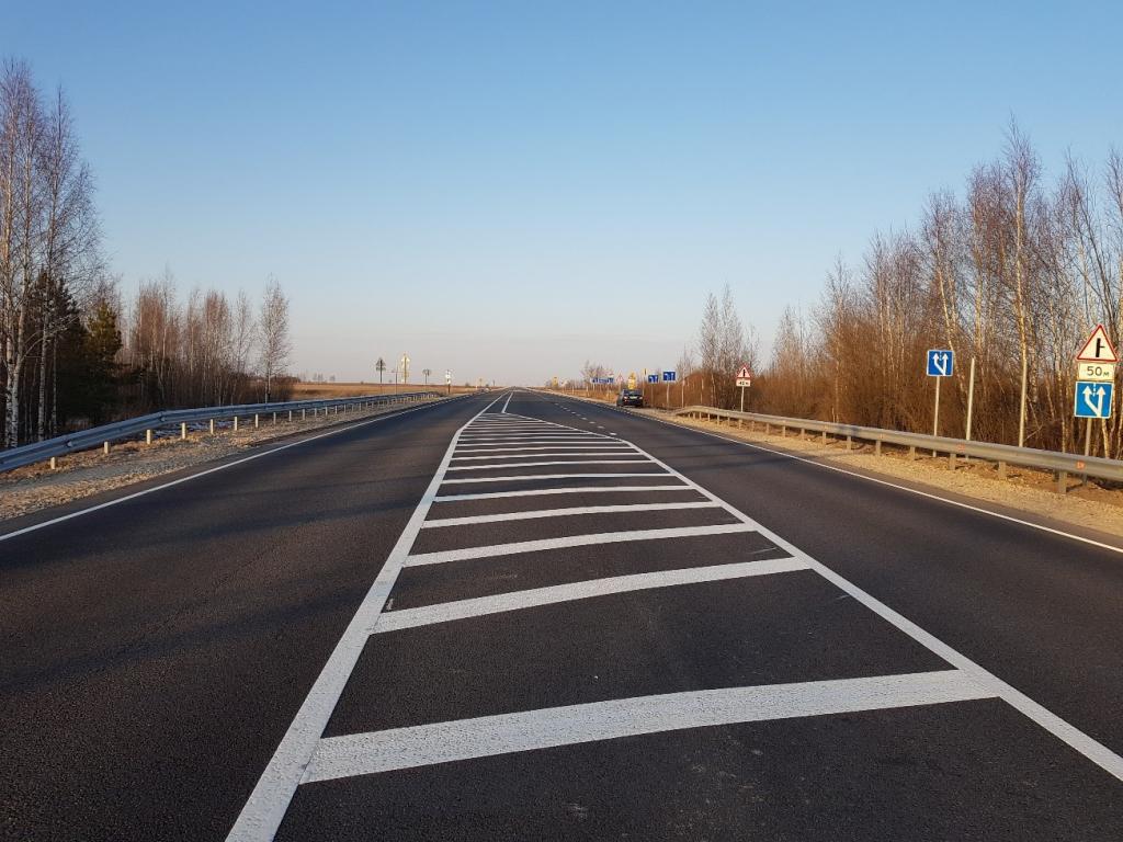 На участке, проходящем через Медведевский район республики, специалисты усилили существующую дорожную одежду методом холодной регенерации и довели ширину проезжей части до нормативов существующей категории. На участке уложили трехслойное покрытие, верхний слой — щебеночно-мастичный асфальтобетон.