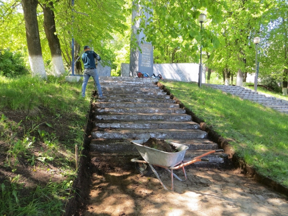 В настоящее время рабочие демонтируют бетонные тротуарные плиты у подножия и на ступенях мемориального комплекса. В качестве покрытия на дорожках и ступенях, ведущих к стеле с Вечным огнем, будет уложена брусчатка и современная тротуарная плитка.