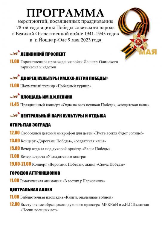 - 11:00 — торжественное прохождение войск Йошкар-Олинского гарнизона и кадетов на Ленинском проспекте;