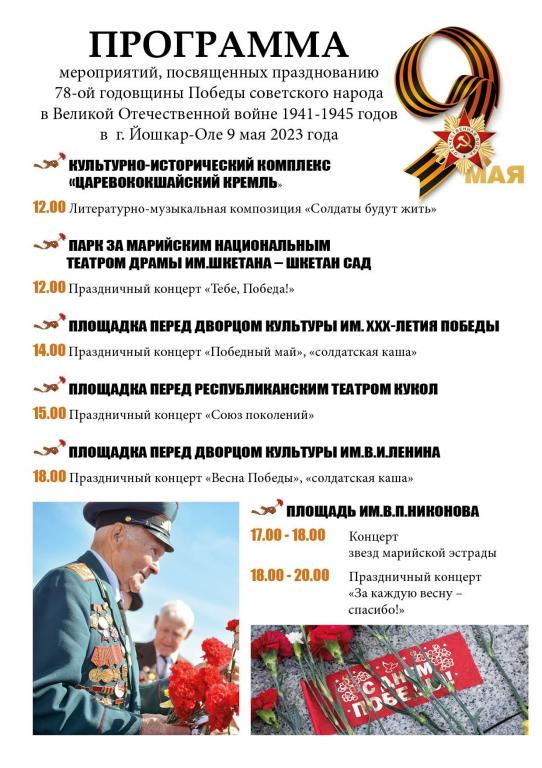 - 12:00 — праздничный концерт «Тебе, Победа!» в парке за Марийским национальным театром драмы имени Шкетана — Шкетан-сад;