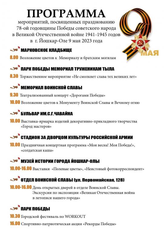 В администрации Йошкар-Олы сообщили программу празднования Дня Победы в марийской столице.