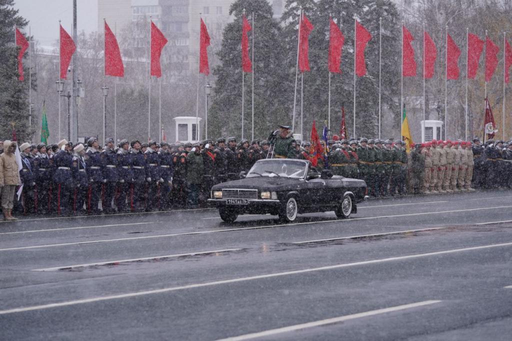 С приветственным словом к участникам обратился полпред президента Игорь Комаров, он подчеркнул особенное значение этого события: «Сегодня Россия вновь на переднем крае борьбы с нацизмом. И как много лет назад по зову сердца внуки и правнуки победителей взяли в руки оружие. Встали на защиту Отечества, мужественно отстаивая свободу и независимость нашей Родины. Граждане нашей многонациональной страны объединились ради Победы, оказывая помощь и поддержку бойцам СВО. Сегодняшний Парад Памяти — это связь с победителями в Великой Отечественной войне. Это также и одно из ключевых мероприятий по сохранению исторической памяти. Парад демонстрирует решимость и единство народов России. Важно, чтобы на этих нерушимых ценностях воспитывались наши дети».