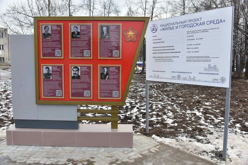 О строительстве Аллеи Героев Главе Марий Эл Александру Евстифееву рассказал директор Дворца культуры им. В.И. Ленина Хаджимурат Гуцунаев. Он отметил, что проделана большая работа: заасфальтированы площадки, установлены бордюры, уложена брусчатка, частично установлено наружное освещение. В парке появилась входная группа, а совсем недавно для йошкаролинцев залит городской каток.