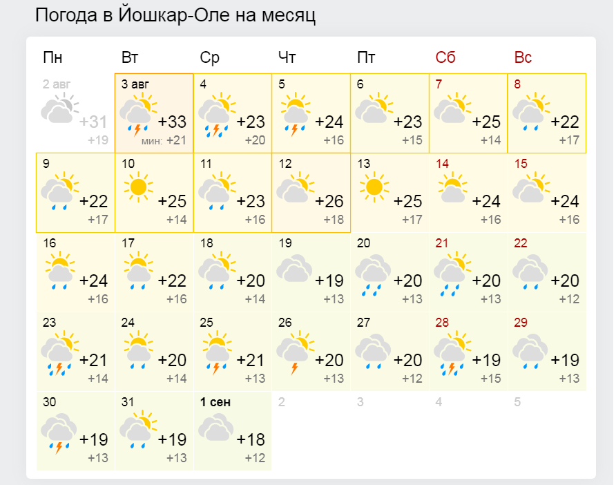 По прогнозам синоптиков, сегодня, 3 августа, в Марий Эл переменная облачность, днём местами кратковременный дождь, гроза. Ветер юго-западный 8-13 м/с, при грозе порывистый. Температура воздуха днём +28...+33ºС.