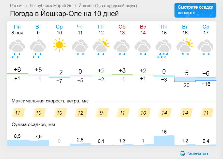 По прогнозам синоптиков, в республику идёт холодный циклон. Завтра в Марий Эл ожидаются осадки — снег с дождём. Температура воздуха в дневные часы от −4ºС до +1ºС, ночью — устойчивый минус. Ветер северный, северо-западный 5-10 м/с.