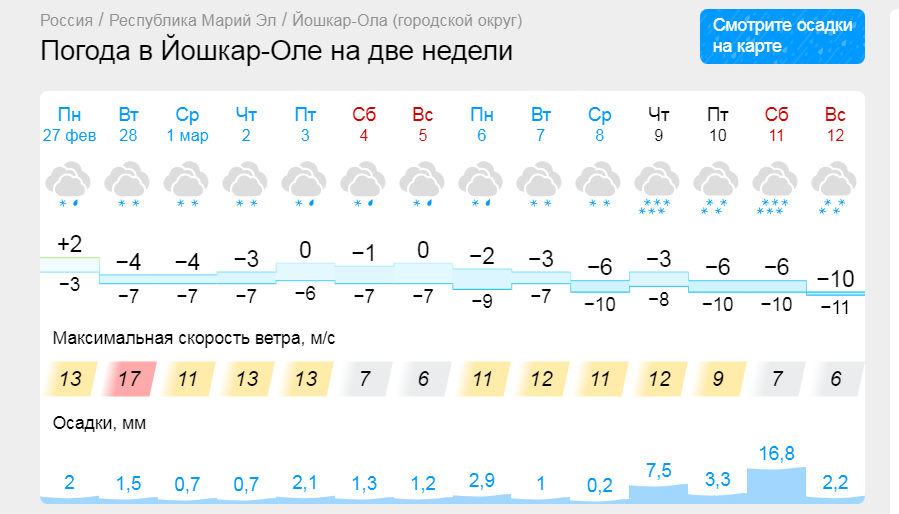 В последний день февраля в Марий Эл облачно с прояснениями, местами небольшой кратковременный снег, метель. Ветер западный 9-14 м/с, днём местами порывы до 17 м/с. Температура воздуха ночью -4...-9ºС, днём -3...-8ºС.