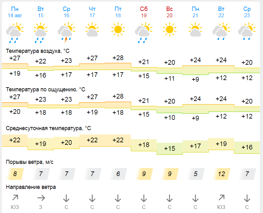 На следующей неделе заметно посвежеет: в дневные часы столбики термометров будут подниматься до отметки всего 20-22 градуса, ночами — опускаться до +9ºС.