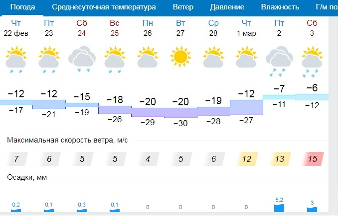 По прогнозам синоптиков, на территории республики ожидается аномально холодная погода. Среднесуточная температурой воздуха будет на 7-13 градусов ниже климатической нормы. По уточнённым данным, последняя неделя февраля и начало марта будут особенно морозными с температурными показателями в ночные часы до −30 °С. Так, в ночь на 25 февраля ожидается до −26 °С, в ночь на 26 — до −29 °С, в ночь на 27 февраля — до −30 °С, в ночь на 28 число — до −28 °С, в ночь на 1 марта — до −27 °С.