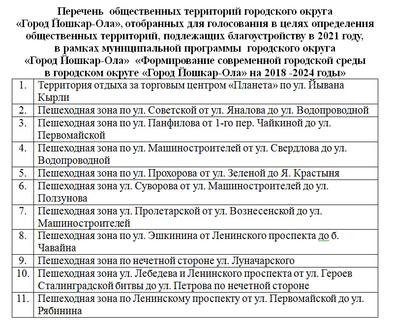 Голосование по выбору общественных территорий для благоустройства в 2021 году по муниципальной программе «Формирование современной городской среды» стартует в пятницу, 17 июля, с 11 часов. В голосовании примут участие 33 общественных пространства Йошкар-Олы.