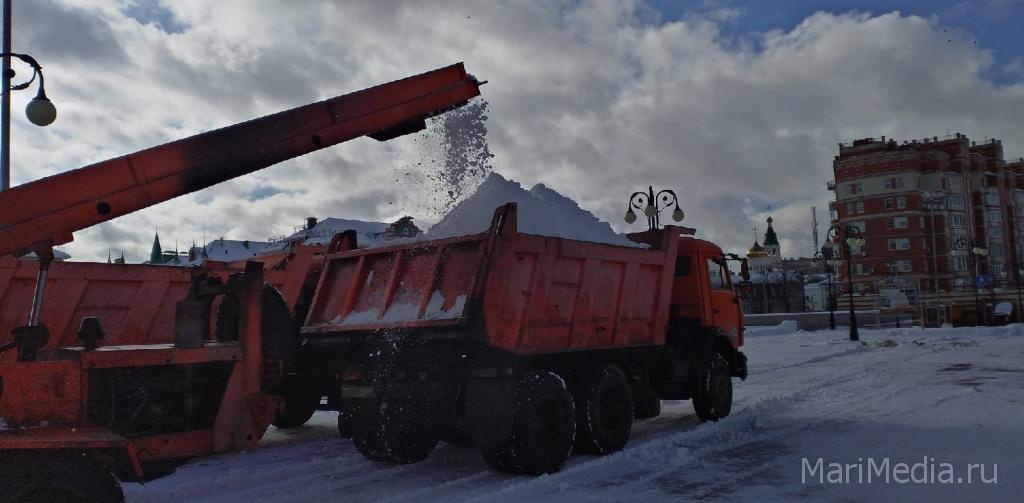В настоящее время снегоуборочная техника продолжает убирать снег с площади Пресвятой Девы Марии. Груженные «КамАЗы» курсируют между площадью и снежной свалкой.