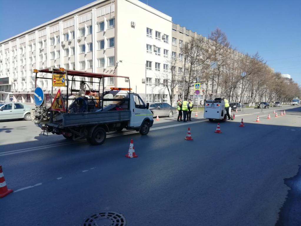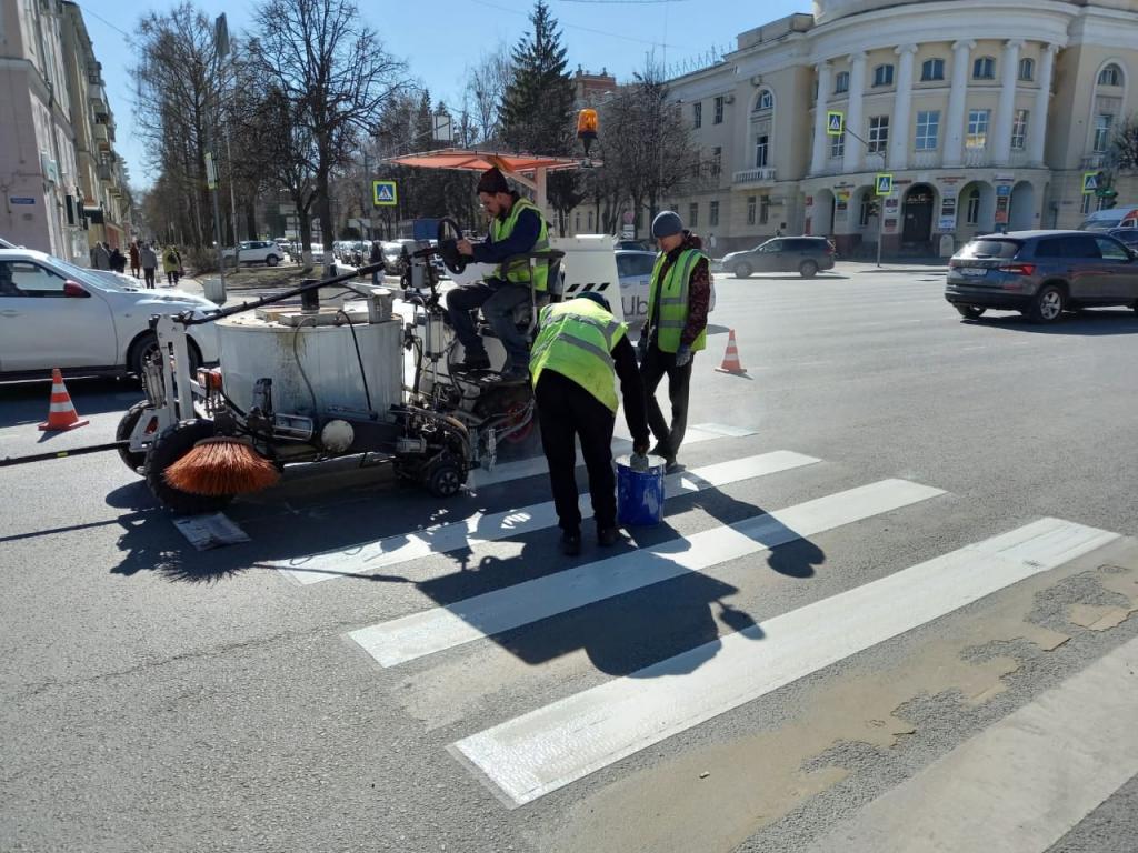 На улицах города продолжаются работы по нанесению дорожной разметки термопластиком. По данным мэрии столицы, в преддверии празднования Дня Победы разметка наносится на Ленинском проспекте и на ул. Первомайской. Ранее была обновлена разметка пешеходных переходов на ул. Пролетарской.
