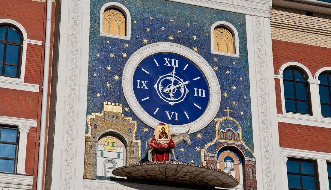 Динамическая скульптурная композиция «Явление иконы Божией Матери «Троеручица», более известная в народе как «Часы с осликом», возобновила свою работу.