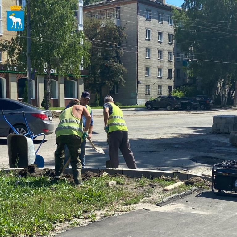 В настоящее время дорожные рабочие занимаются установкой бортовых камней и фрезерованием старого покрытия.