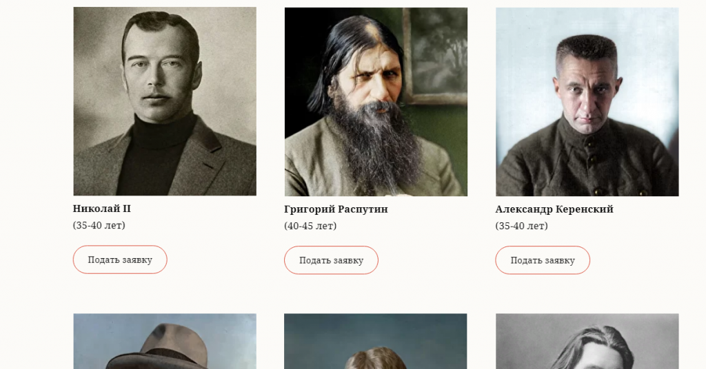 Дмитрий Матвеев — сотрудник режиссёрского центра — специально приехал в Марий Эл, чтобы разглядеть в толпе нужных кандидатов на роль в сериале. Команда создателей задумала выбрать простых людей из народа, чтобы придать картине колоритность и эффект «реального времени». При этом основное требование при подборе — максимальное сходство с историческими персонажами. В столице Марий Эл двойники пока не обнаружились.