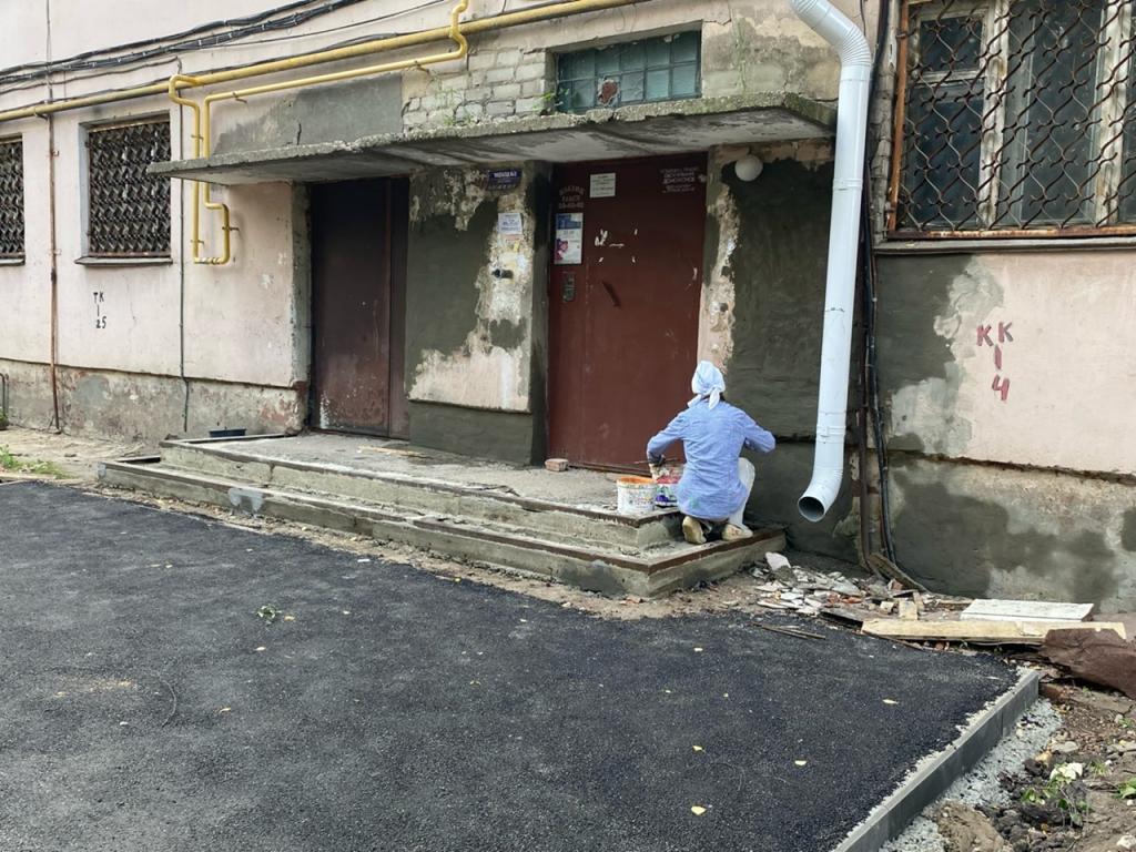 Проводимая дорожниками работа поддерживается и управляющей компанией, которая занялась ремонтом фасадной части и входных групп.