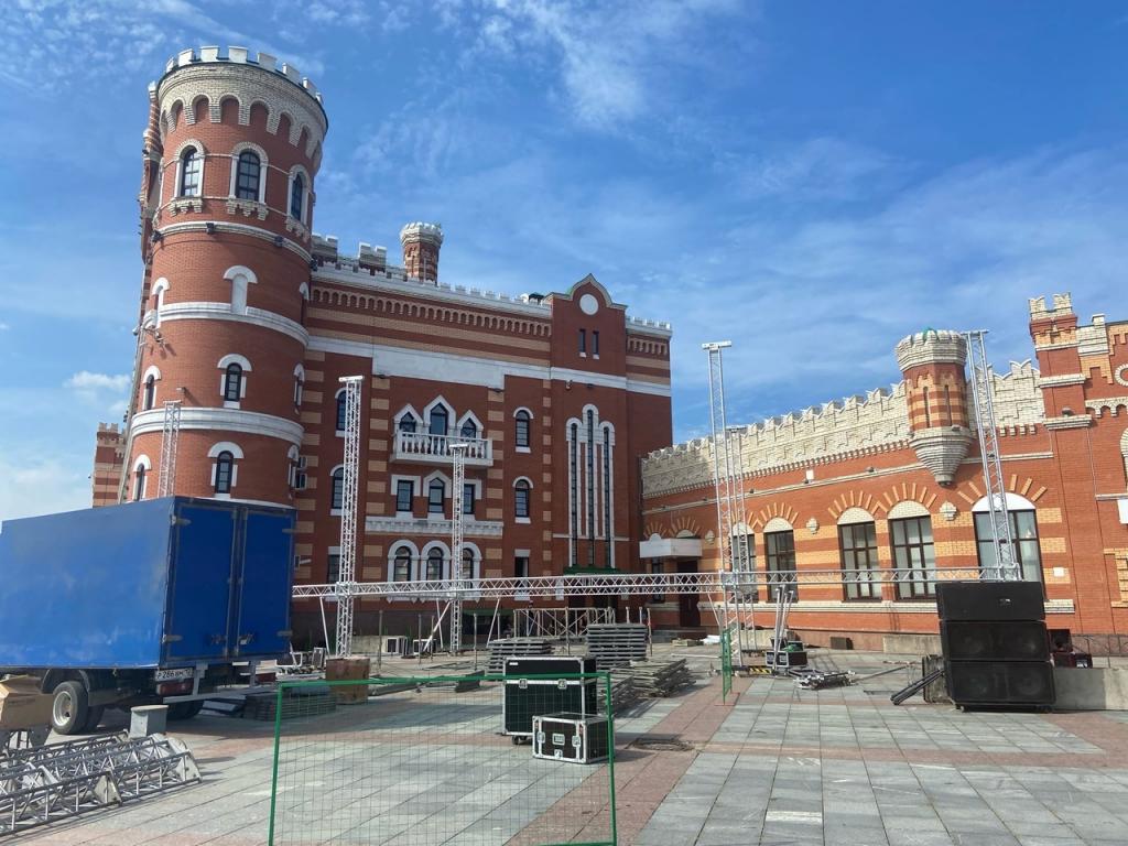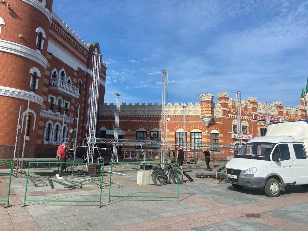 Кроме того, на площади производят монтаж сцены, на которой в предстоящие выходные будет проходить концертная программа, в том числе звёздные выступления.