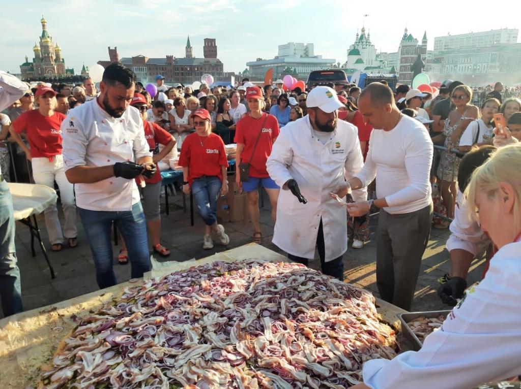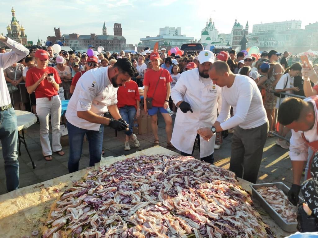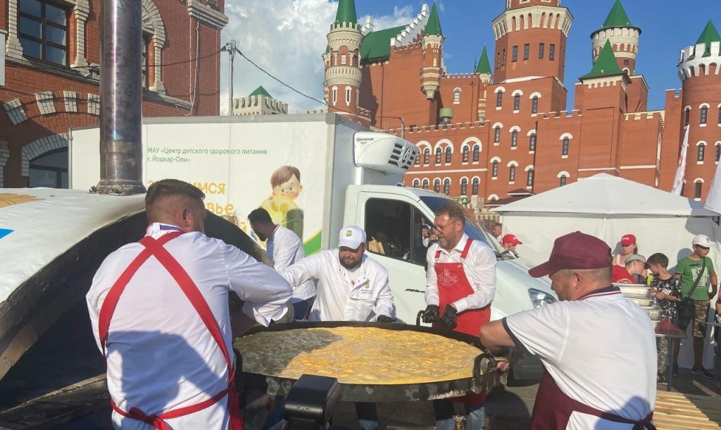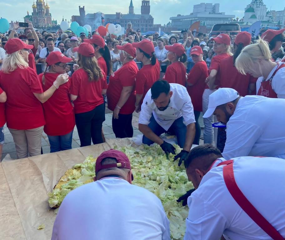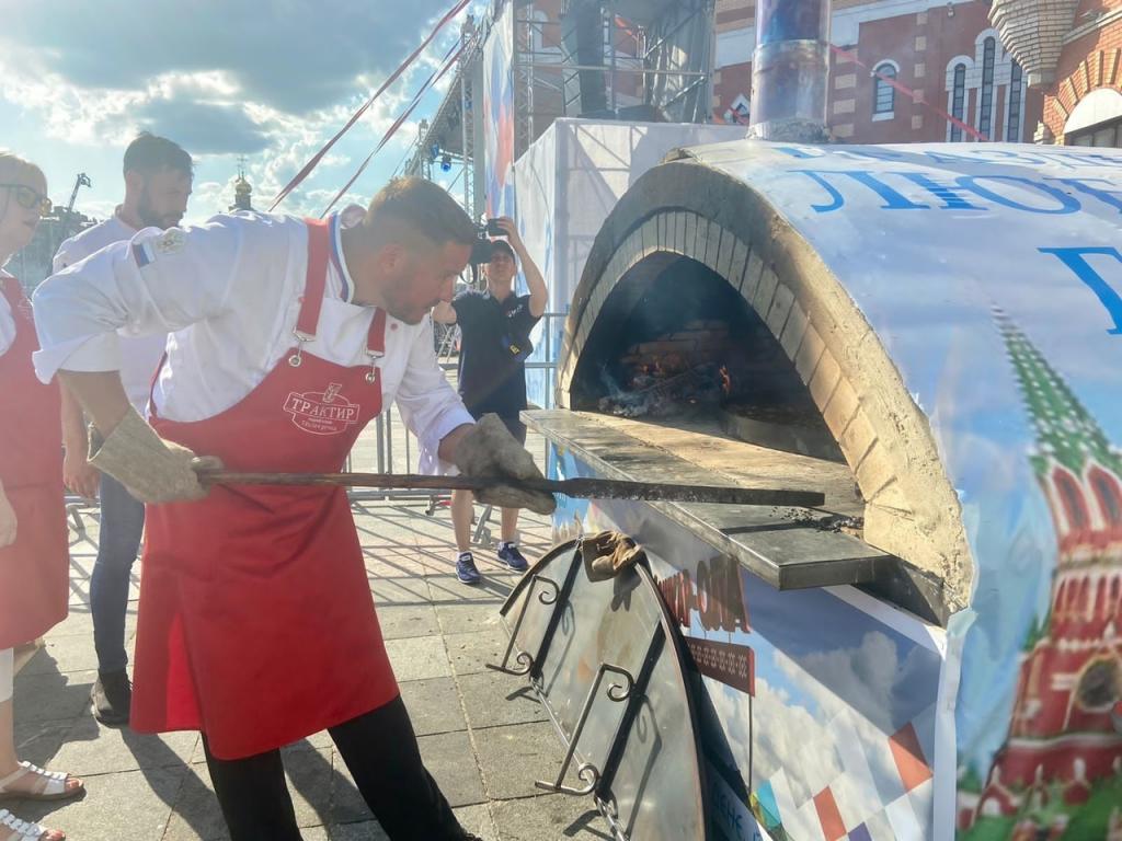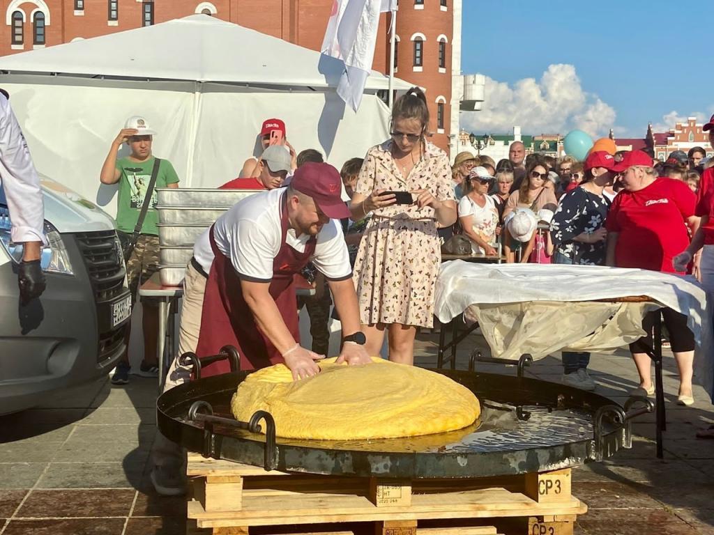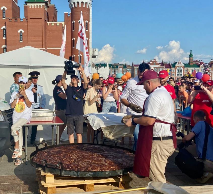 На Патриаршей площади «кипит» работа по приготовлению необычно большого яства — рекордного марбургера, к поварам присоединился мэр Йошкар-Олы Евгений Маслов.
