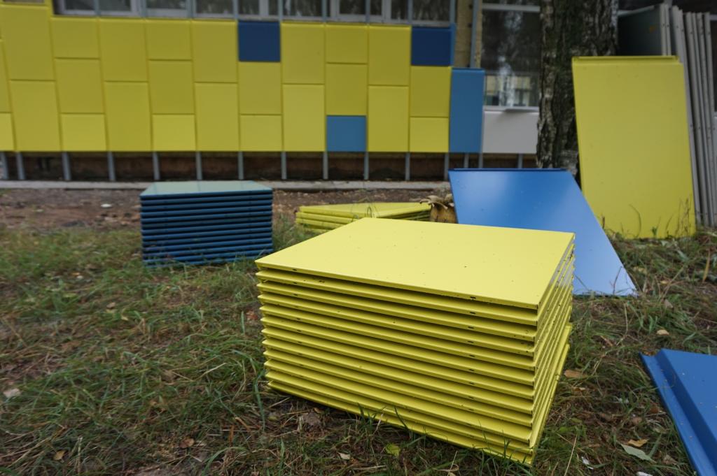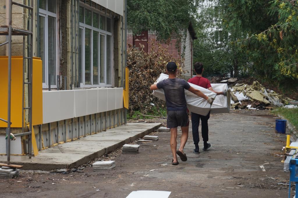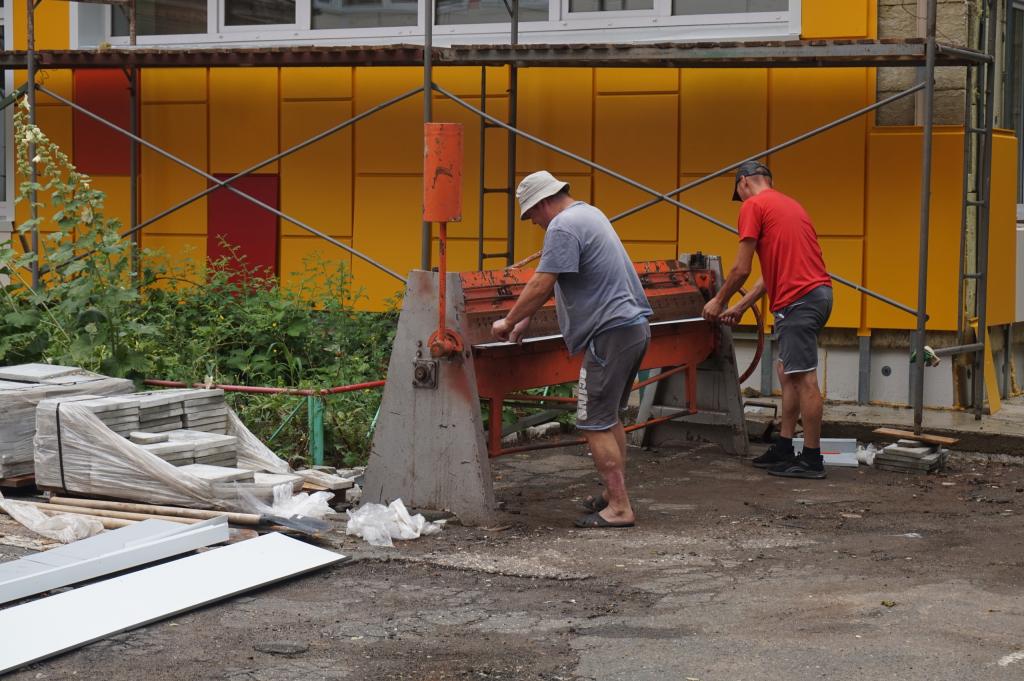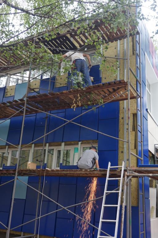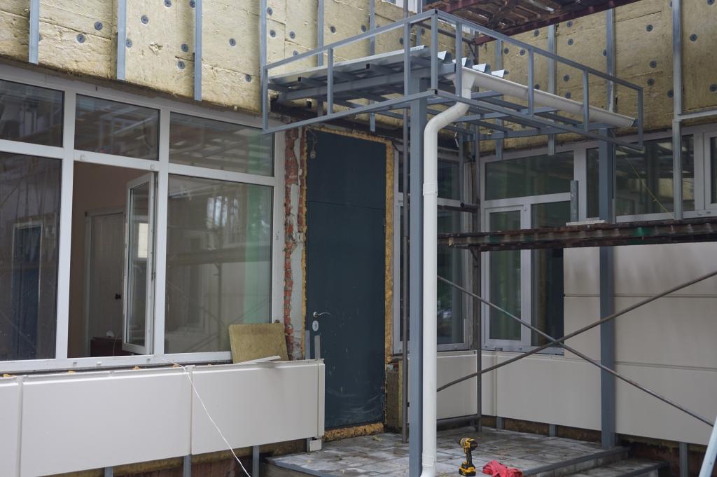 На сегодняшний день сотрудники подрядной организации уже выполнили работы по утеплению фасада здания, сделали отмостки, установили новые железные двери, заменили оконные блоки, установили новые пожарные лестницы, а также выложили плиткой дорожки вокруг здания.