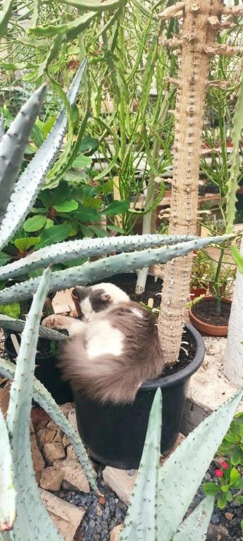 Как выяснилось, в выборе места расположения коты не стесняются: это и цветочные горшки, кашпо, тазы, вёдра, коробки и контейнеры, отопительные и вентиляционные трубы. Несмотря на тёплые шубы и экваториальный климат, полосатые охранники Ботанического сада уютно расположились поближе к батареям и отопительным приборам.