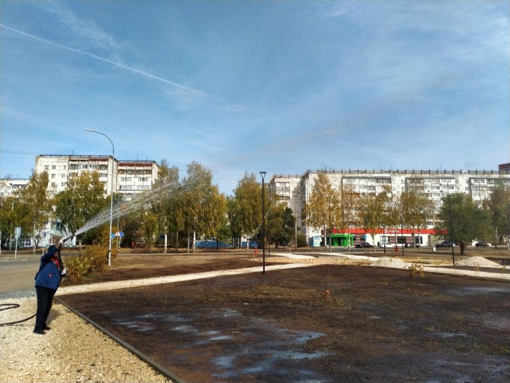 МУП «Город» регулярно поливает газон и кустарники. Газонная трава уже взошла, и аллея окрасилась в зелёный цвет.