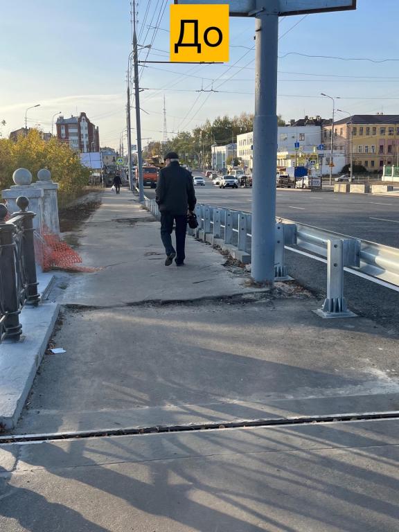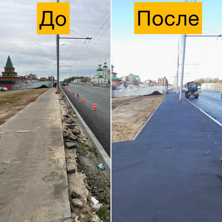 Сотрудники МУП «Город» укладывают новое покрытие на тротуаре от заезда на парковку к магазину «Евроспар» до моста.