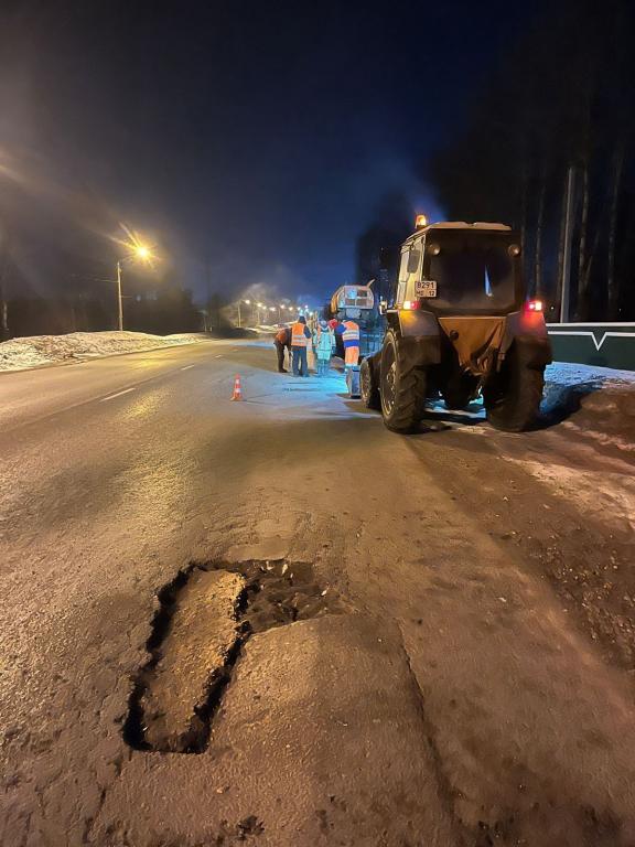 Этой ночью в Йошкар-Оле начали ямочный ремонт дорог литым асфальтобетоном.