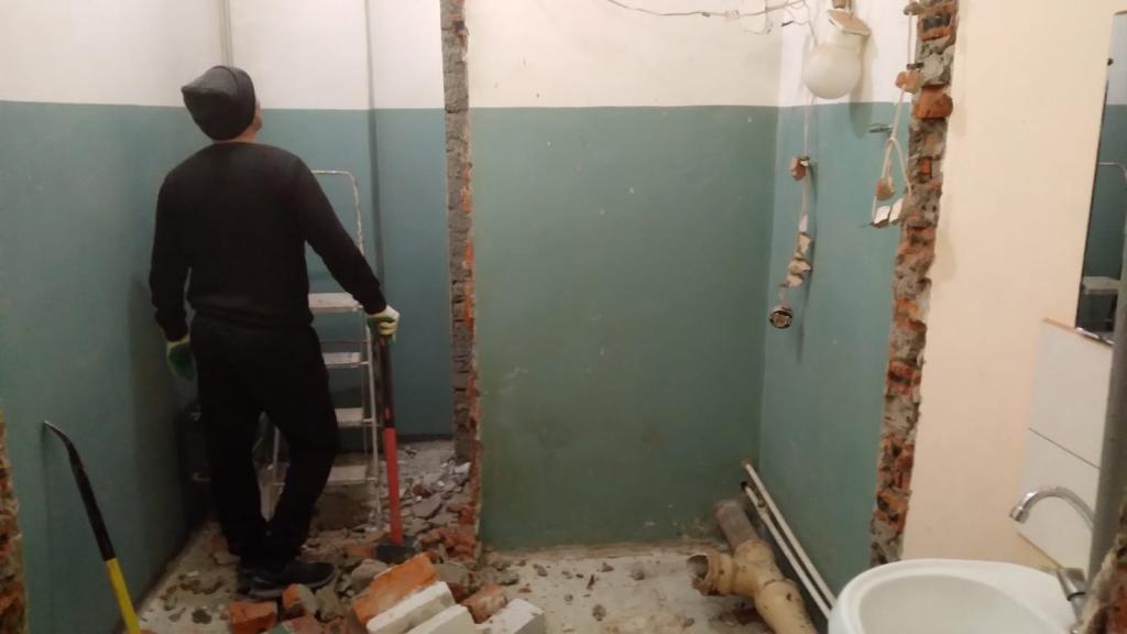 Подрядная организация сейчас занята электромонтажными работами и ремонтом санитарных зон. Также здесь выравнивают стены внутренних помещений и заливают полы.