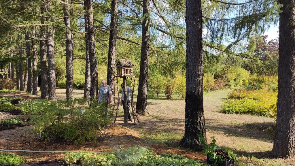 В Ботаническом саду на лиственничной аллее установили домик-кормушку для белок. Он прекрасно вписался в окружающий пейзаж.