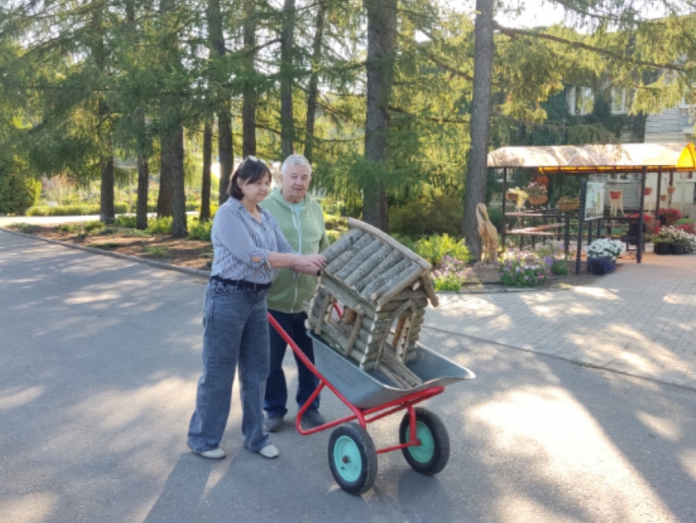 Кормушку смастерил Васенёв Виктор Александрович из природного материала. В ход пошли брёвнышки и ветки различных древесных растений, которые накопились после формирующей и санитарной обрезки деревьев и кустарников. Опорой послужила сломленная ураганным ветром лиственница.
