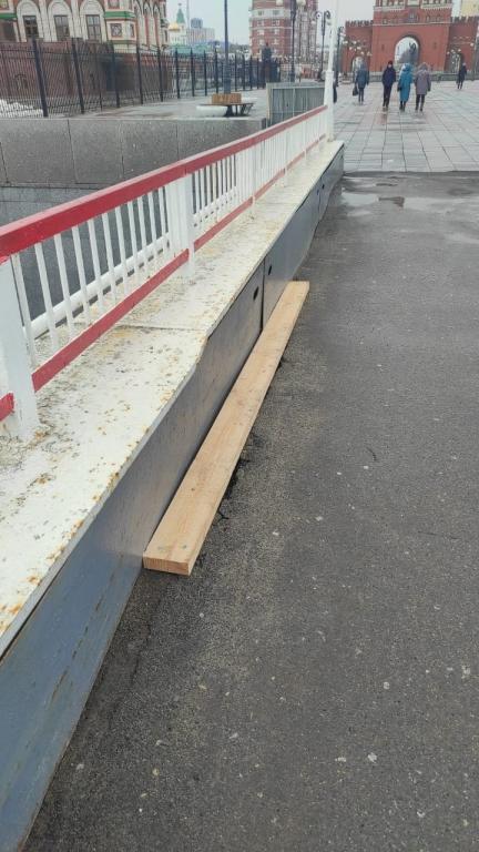 Жительница Йошкар-Олы обратила внимание, что на Театральном мосту размыло асфальт. Об этом она сообщила в паблик администрации города.
