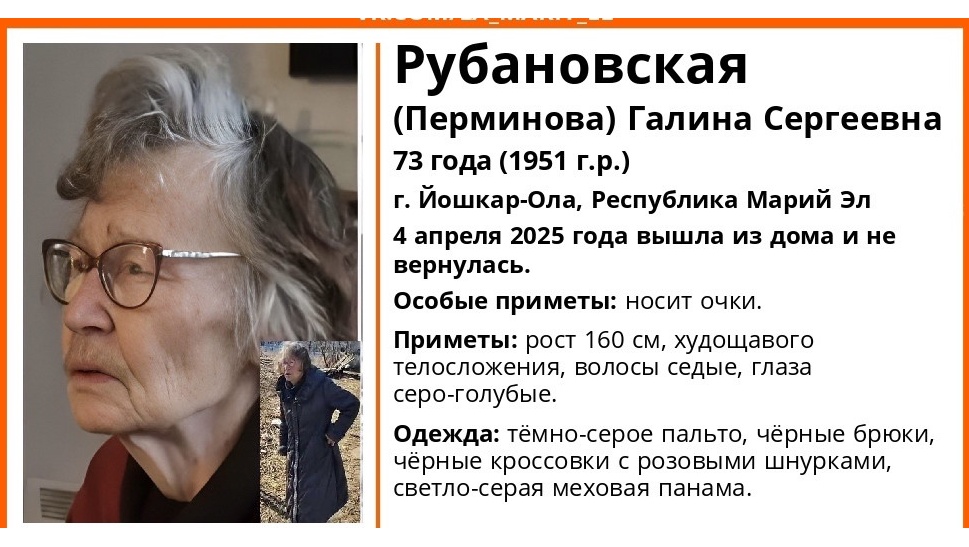 В Йошкар-Оле накануне пропала 73-летняя Рубановская (Перминова) Галина Сергеевна.